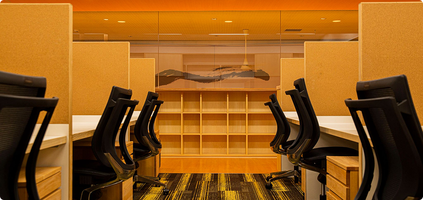 完全な無音ではなく、人の気配を感じられる空間とすることで、孤独ではない、仲間と共に学ぶ環境を演出しています。